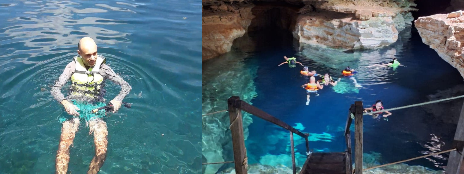 Um dia de flutuação. Dentro de uma caverna e a céu aberto, como em uma aquário natural. Águas incrivelmente cristalinas, um mundo submerso deslumbrante.